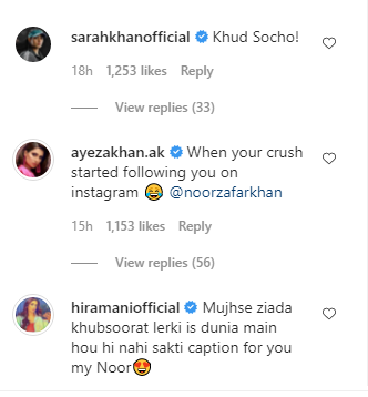 اسکے علاوہ اداکارہ حرا مانی نے کمینٹ میں جواب دیا ہے کہ ،’ آپ کی تصویر کے لئے یہ کیپشن ہونا چاہیئے ، مجھ سے زیادہ خوبصورت لڑکی اس دنیا میں ہو ہی نہیں سکتی ہے‘۔