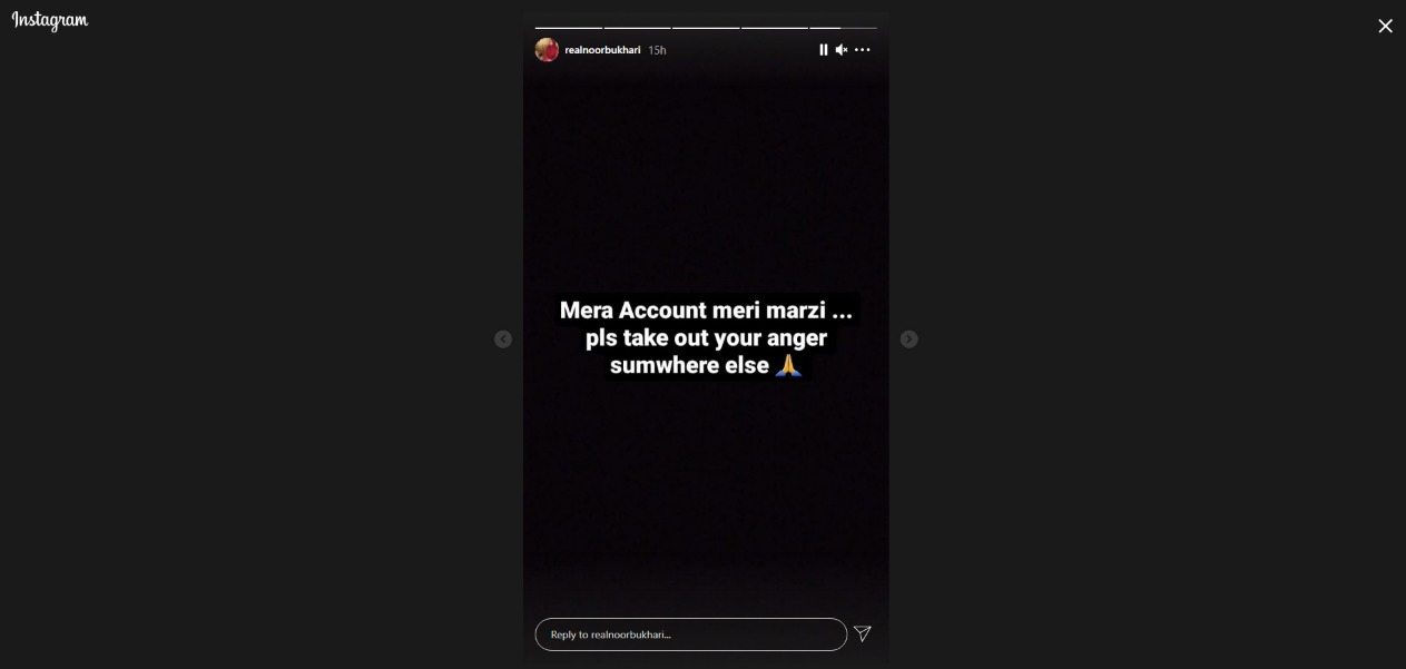 نور بخاری نے اپنی انسٹاگرام اسٹوری پر تینقید کرنے والوں کو جواب دیتے ہوئے کہا ہے کہ ’میرا اکاؤنٹ میری مرضی‘۔