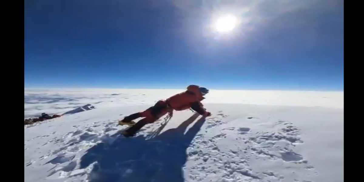 اب آپ سوچیں گے کہ اس میں کونسی بڑی بات ہے؟ تو بڑی بات یہ ہے زمین سے میلوں اوپر برف سے ڈھکی کے2 کی چوٹی پر یہ کوہ پیما پش اپس لگاتا نظر آئیگا۔