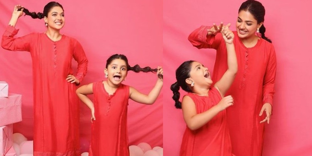 تصاویر میں صنم اور ان کی بیٹی لال رنگ کا لباس زیب تن کی ہوئی ہیں جسے مداحوں کی جانب سے بہت پسند کیا جا رہا ہے۔