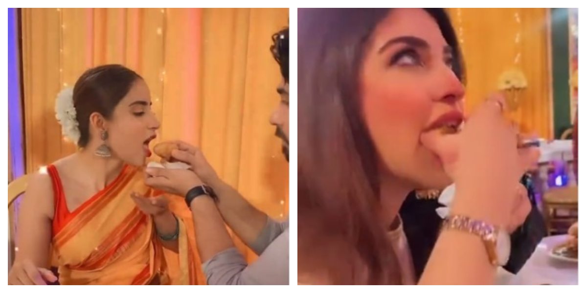 پاکستانی اداکار علی انصاری اپنی منگیتر اداکارہ صبور علی کو گول گپے کھلا رہے ہیں ۔