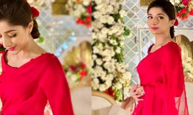 ماورہ حسین کی جانب سے پوسٹ کی جانے والی تصاویر میں دیکھا جا سکتا ہے کہ اداکارہ لال رنگ کی ساڑھی زیب تن کی ہوئی ہیں۔
