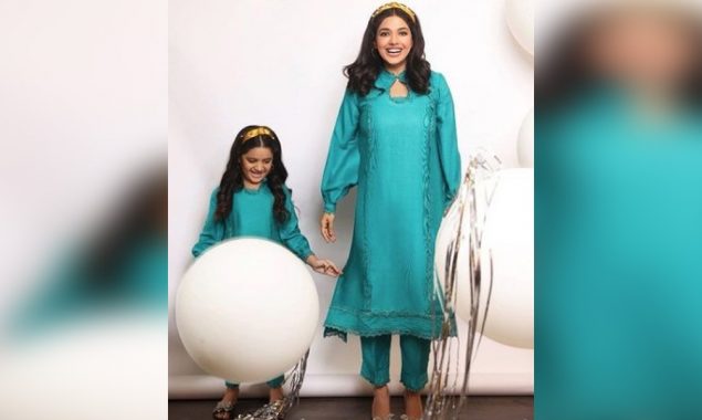 تصویر میں صنم اور ان کی بیٹی آسمانی رنگ کا لباس زیب تن کی ہوئی ہیں۔