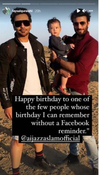 اداکار فیصل قریشی نے اپنی انسٹااسٹوری پر اعجاز اسلم اور اپنے بیٹے فرمان قریشی کے ساتھ ایک اور یادگار تصویر شیئر کرتے ہوئے لکھا کہ اِس شخص کو سالگرہ مبارک ہو جو کہ اُن کے لئے ایسے لوگوں میں سے ایک ہے جس کی سالگرہ اُنہیں فیس بُک پر ریمائنڈر کے بغیر بھی یاد رہتی ہے۔