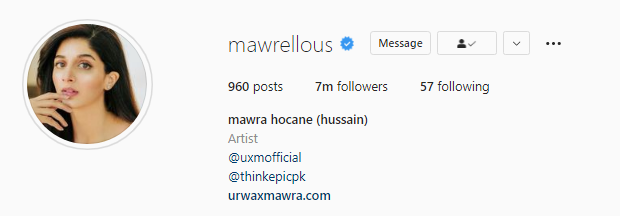ماورہ کے انسٹا گرام اکاؤنٹ پر 7ملین فالوورز ہیں جبکہ خود انہوں نے صرف 57انسٹا صارفین کو فالو کیا ہوا ہے اور اب تک  صرف 959انسٹا پوسٹس شیئر کی ہیں۔