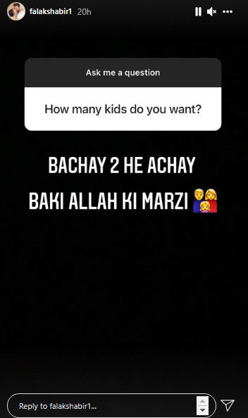 اس دوران ایک مداح کے سوال کا جواب دیتے ہوئے فلک شبیر نے بتایا ہے کہ انہیں 2 بچوں کی خواہش ہے لیکن اللہ کی جو مرضی ہوگی میں اس میں راضی ہوں۔