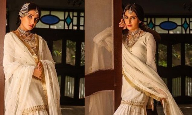 شئیر کی گئی تصاویر میں دیکھا جاسکتا ہے کہ اداکارہ نے سفید رنگ کا غرارہ زیب تن کیا ہوا ہے۔