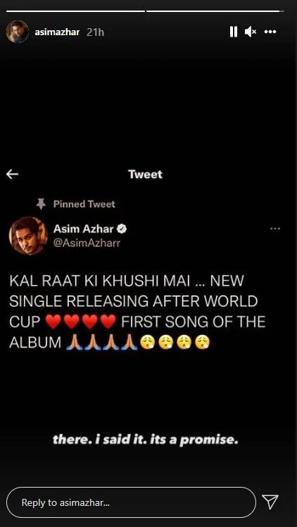 ٹی ٹوئنٹی ورلڈکپ کے دوران سوشل میڈیا پر فعال عاصم اظہر نے اپنے ٹوئٹ میں اعلان کیا تھا کہ وہ پاکستان کے میچ جیت جانے کی خوشی میں جلد ہی اپنا گانا ریلیز کریں گے۔