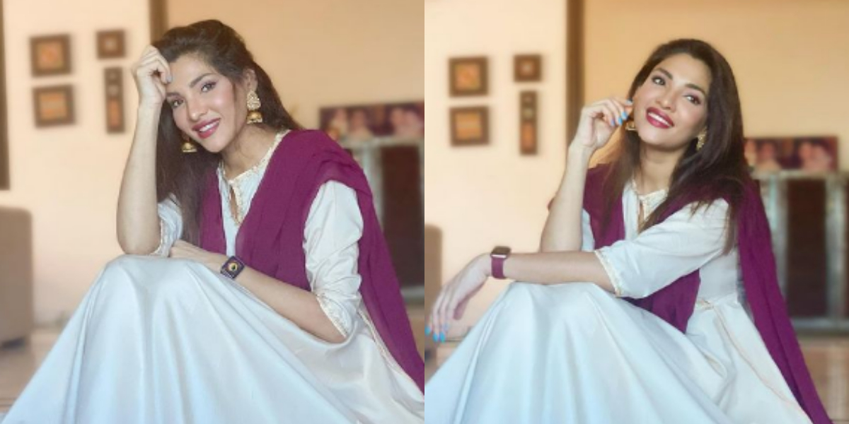 شئیر کی گئی تصاویر میں اداکارہ نے سفید فراک زیب تن کیا ہوا ہے جبکہ دوپٹے کا کلر جامنی ہے ۔