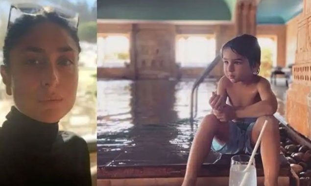 اداکارہ کی جانب سے شئیر کی گئی تصویر میں تیمور پانی میں بھیگے ہوئے پول کے کنارے بیٹھے ہیں اور پاس میں جوس کا گلاس رکھا ہوا ہے۔