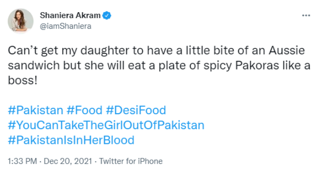 شنیرا اکرم نے ٹوئٹر پر کھانے میں اپنی بیٹی عائلہ کی پسند کے بارے میں بتاتے ہوئے کہا کہ ان کی بیٹی جو آسٹریلوی سینڈویچ کا ایک نوالہ نہیں کھا سکتی وہ مصالحے دار پکوڑوں کی پوری پلیٹ آرام سے کھا سکتی ہے۔