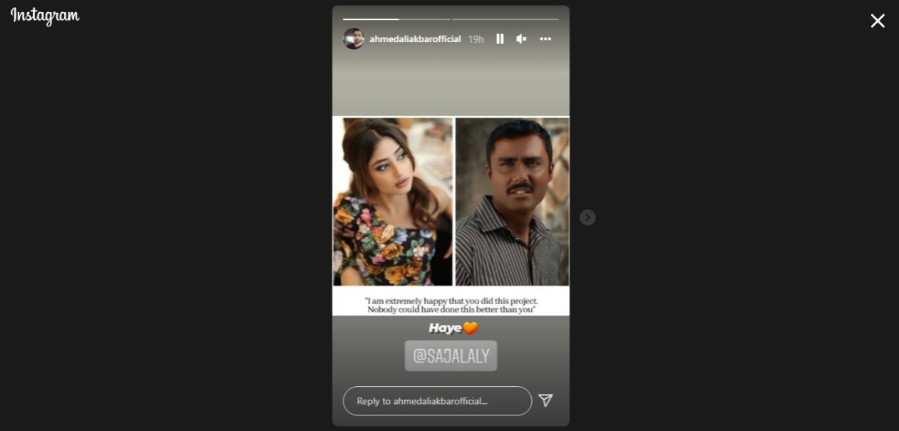 اس سے قبل سجل علی کی جانب سے اداکار احمد علی اکبر کے لئے تعریفی پیغام جاری کیا گیا تھا۔