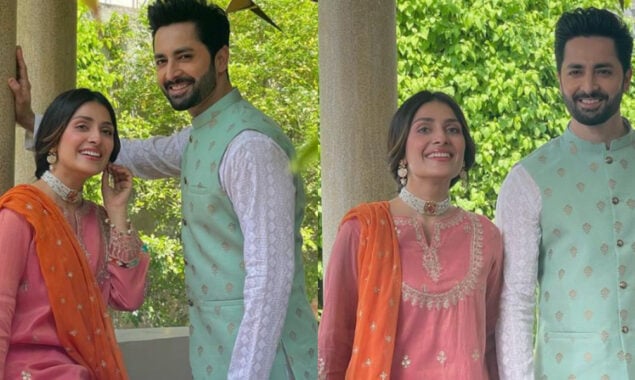 ان تصاویر میں یہ دونوں اداکار ایک ساتھ بہت خوش نظر آرہے ہیں ،عائزہ خان خوبصورت غرارہ زیب تن کی ہوئی ہیں جبکہ دانش تیمور قیمض شلوار پہنے ہوئے ہیں۔