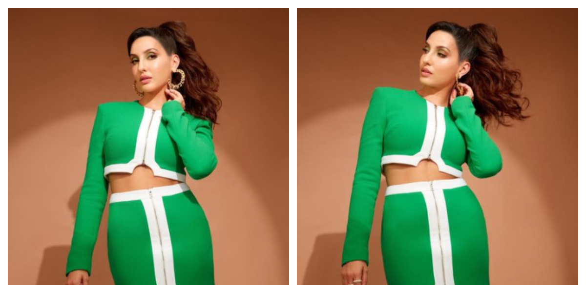 نورا فتیحی کی جانب سے انسٹاگرام پر پوسٹ کی جانے والی تصاویر میں دیکھا جا سکتا ہے کہ ڈانسر ہرے رنگ کا لباس زیب تن کی ہوئی ہیں۔