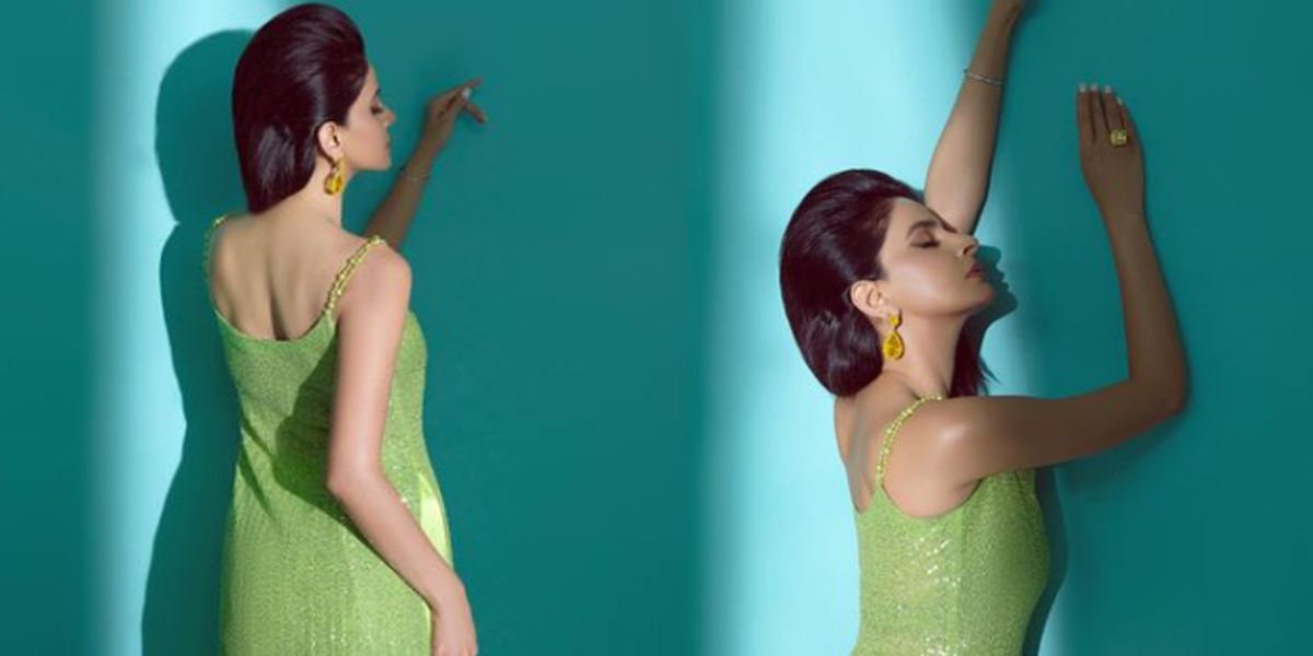 شیئر کی گئیں تصاویر میں دیکھا جاسکتا ہے کہ ادکارہ نے سبز رنگ کا مغربی لباس زیب تن کیا ہوا ہے جس میں ان کی کمر واضح نظر آرہی ہے۔