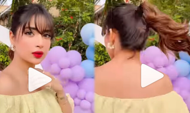 شیئر کی گئی ویڈیو میں دیکھا جاسکتا ہے کہ صبور علی نے پیلے اور سیاہ رنگ کا انتہائی غیر مناسب لباس زیب تن کیا ہوا ہے۔