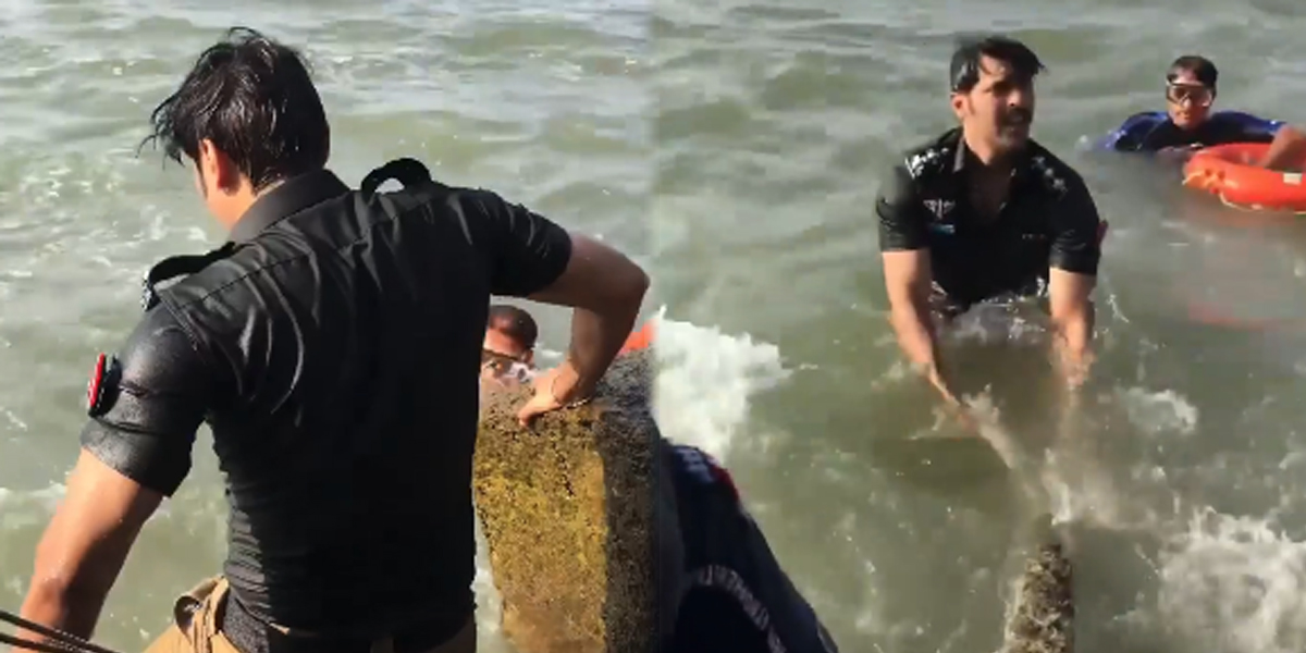 شیئر کی گئی ویڈیو میں دیکھا جاسکتا ہے کہ اداکار پہلے سمندر میں اترتے ہیں اور پھر رسی کے ذریعے اوپر آنے کی کوشش کرتے ہیں۔