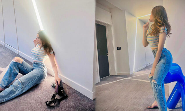 معروف ماڈل نے کچھ تصاویر بیٹھ کر جبکہ کچھ تصاویر کھڑے ہو کر بنوائیں۔