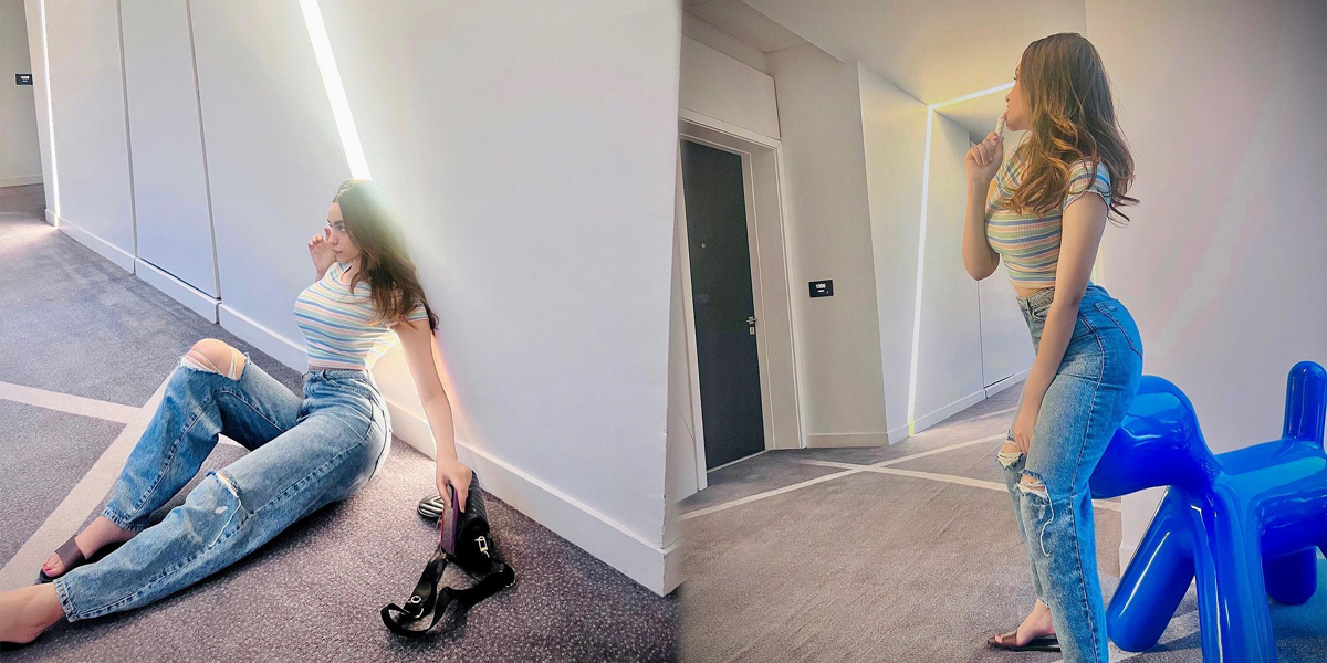 معروف ماڈل نے کچھ تصاویر بیٹھ کر جبکہ کچھ تصاویر کھڑے ہو کر بنوائیں۔