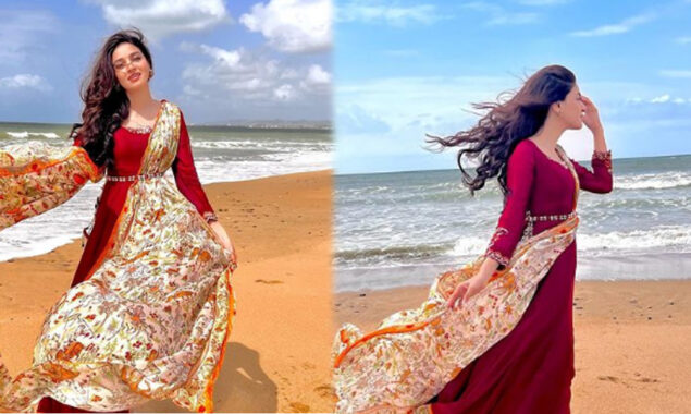 شیئر کی گئی تصاویر میں دیکھا جاسکتا ہےکہ انمول بلوچ ساحلِ سمند ر پر موجود ہیں جہاں انہوں نے سرخ رنگ کا خوبصورت لباس زیب تن کیا ہوا ہے۔