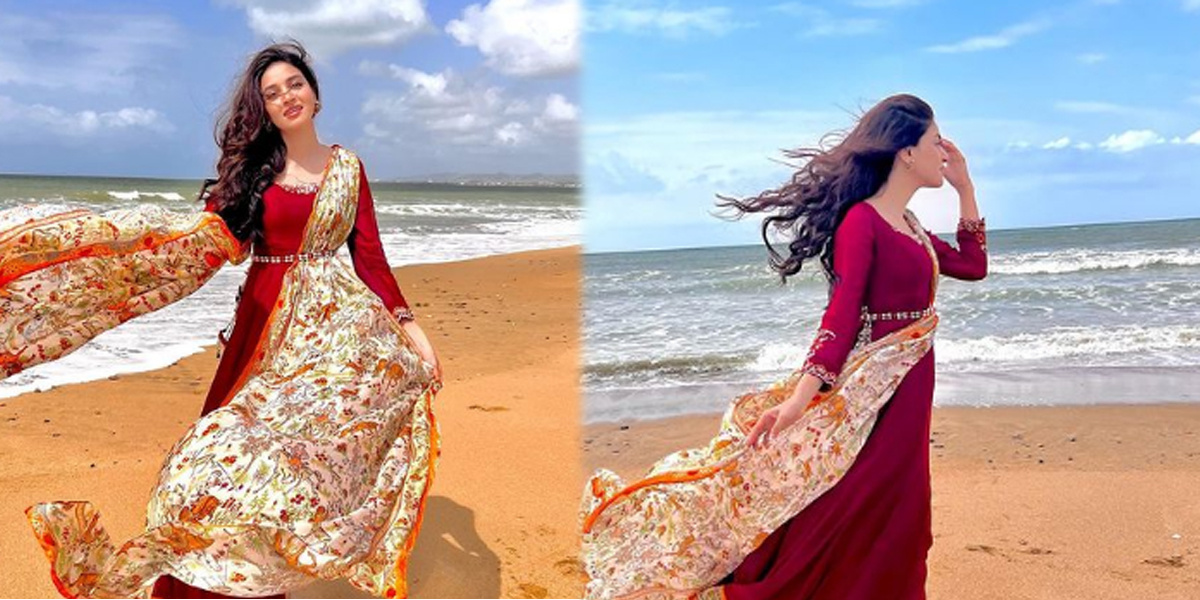 شیئر کی گئی تصاویر میں دیکھا جاسکتا ہےکہ انمول بلوچ ساحلِ سمند ر پر موجود ہیں جہاں انہوں نے سرخ رنگ کا خوبصورت لباس زیب تن کیا ہوا ہے۔