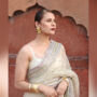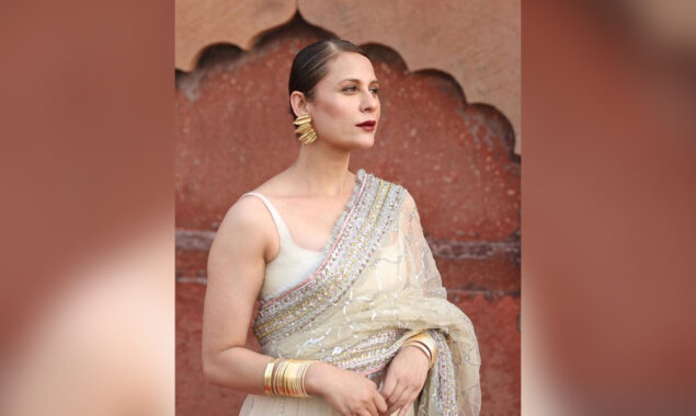 وائرل تصویر میں دیکھا جاسکتا ہے کہ نوشین شاہ نے کریم رنگ کی ساڑھی پہنی ہوئی ہے۔
