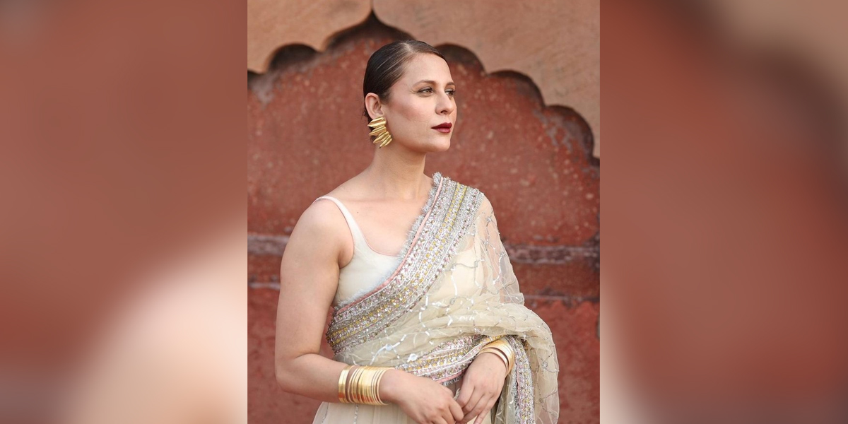 وائرل تصویر میں دیکھا جاسکتا ہے کہ نوشین شاہ نے کریم رنگ کی ساڑھی پہنی ہوئی ہے۔