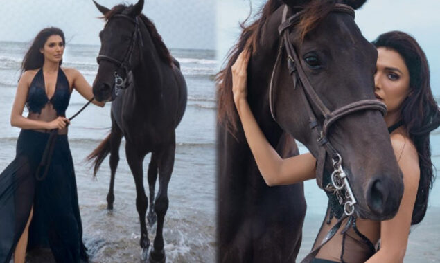 شیئر کی گئی تصاویر میں دیکھا جاسکتا ہے کہ آمنہ الیاس ساحل سمندر پر موجود ہیں جہاں انہوں نے سیاہ رنگ کا انتہائی نازیبا لباس زیب تن کیا ہوا ہے اور گھوڑے کے ساتھ تصاویر بنوائیں۔