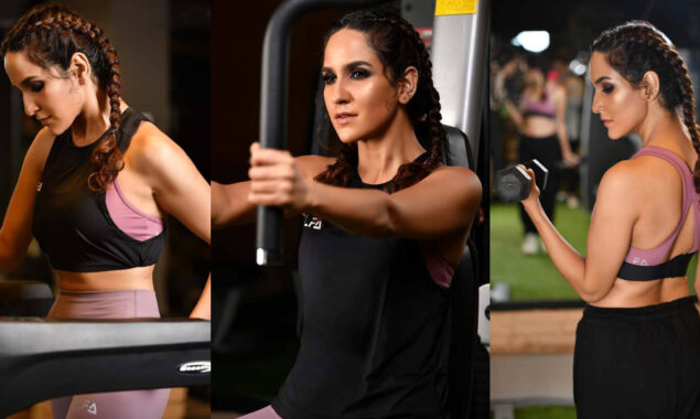 شیئر کی گئی تصاویر میں دیکھا جاسکتا ہے کہ انوشے عباسی نے انتہائی بولڈ لباس زیب تن کیا ہوا ہے اور وہ جم میں ایکسر سائز کر رہی ہے۔