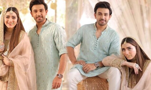 سوشل میڈیا پر وائرل تصاویر میں دیکھا جاسکتا ہے کہ اداکار آسمانی رنگ کا کُرتا شلوار زیب تن کیے ہوئے ہیں جبکہ اداکارہ پیچ کلر کا خوبصورت لباس زیب تن کی ہوئی ہیں۔