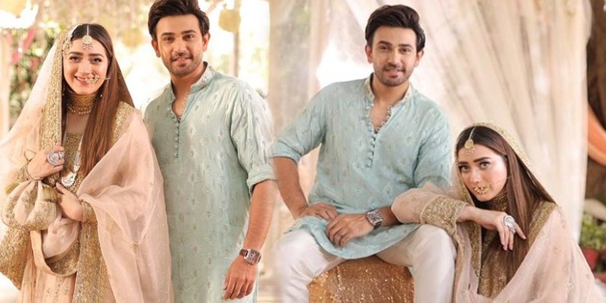سوشل میڈیا پر وائرل تصاویر میں دیکھا جاسکتا ہے کہ اداکار آسمانی رنگ کا کُرتا شلوار زیب تن کیے ہوئے ہیں جبکہ اداکارہ پیچ کلر کا خوبصورت لباس زیب تن کی ہوئی ہیں۔