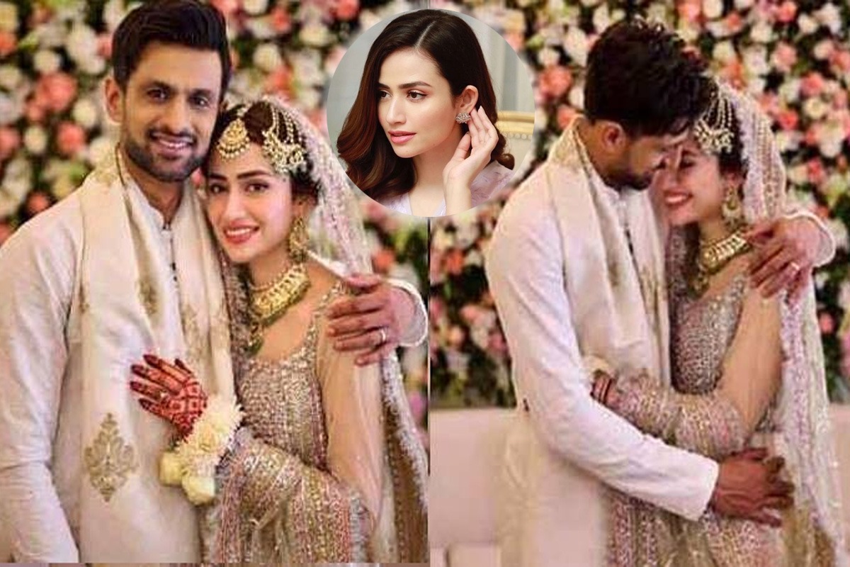شعیب ملک کی جانب سے سوشل میڈیا پر شیئر کی گئی تصاویر میں دیکھا جا سکتا ہےکہ ان کی اہلیہ ثناء جاوید نے شادی کے موقع پر انگوری اور ہلکے گلابی امتزاج کے یہ قیمتی لباسزیب تن کیا ہوا ہے۔