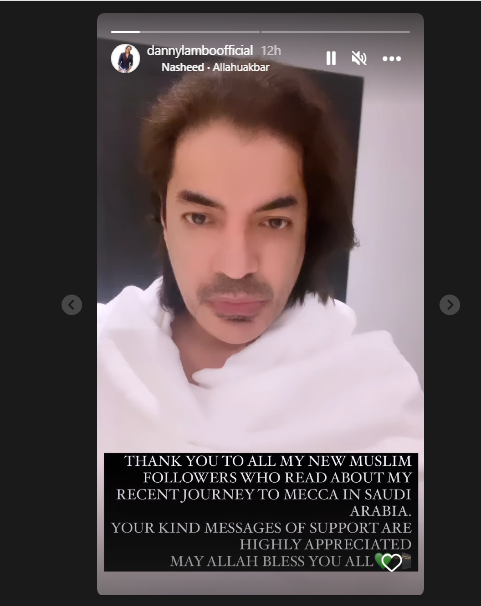 رئیلٹی ٹی وی سٹار، گلوکار، اداکار اور کاروباری شخصیت ڈینی لیمبو نے قبولِ اسلام کا اعلان اپنے انسٹاگرام اکاؤنٹ پر کیا اور مسجد الحرام میں عمرے کی ادائیگی کی ایک ویڈیو بھی پوسٹ کی۔