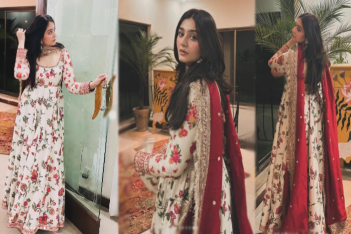حال ہی میں اداکارہ درفشاں سلیم نے سوشل میڈیا کی فوٹو اینڈ ویڈیو شیئرنگ ایپ انسٹاگرام پر ایک نئی پوسٹ جاری کی جس میں وہ آئیوری رنگ کی حسین پشواس پہنی ہوئی ہیں جس پر سرخ اور نارنجی پھول بنے ہوئے ہیں جبکہ اس کے ساتھ چوڑی دار پاجامہ پہن رکھا ہے۔
