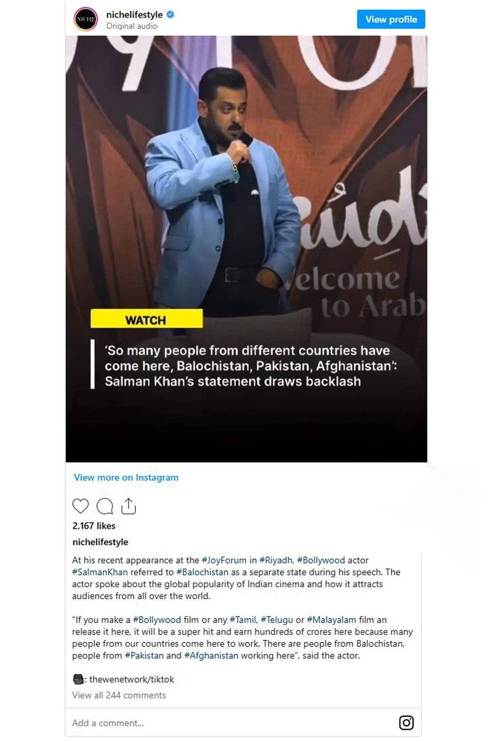 سلمان خان نے بلوچستان کو الگ سے اور پاکستان کو ایک علیحدہ ریاست کے طور پر ذکر کیا، جس پر سوشل میڈیاصارفین نے شدید برہمی کا ظہار کیا۔