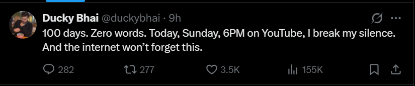 سماجی رابطے کی ویب سائٹ ایکس پر جاری اپنے مختصر بیان میں ڈکی بھائی نے بتایا کہ وہ 100 روز تک ایک بھی لفظ نہ بولنے کے بعد آج شام 6 بجے اپنی خاموشی توڑنے والے ہیں۔