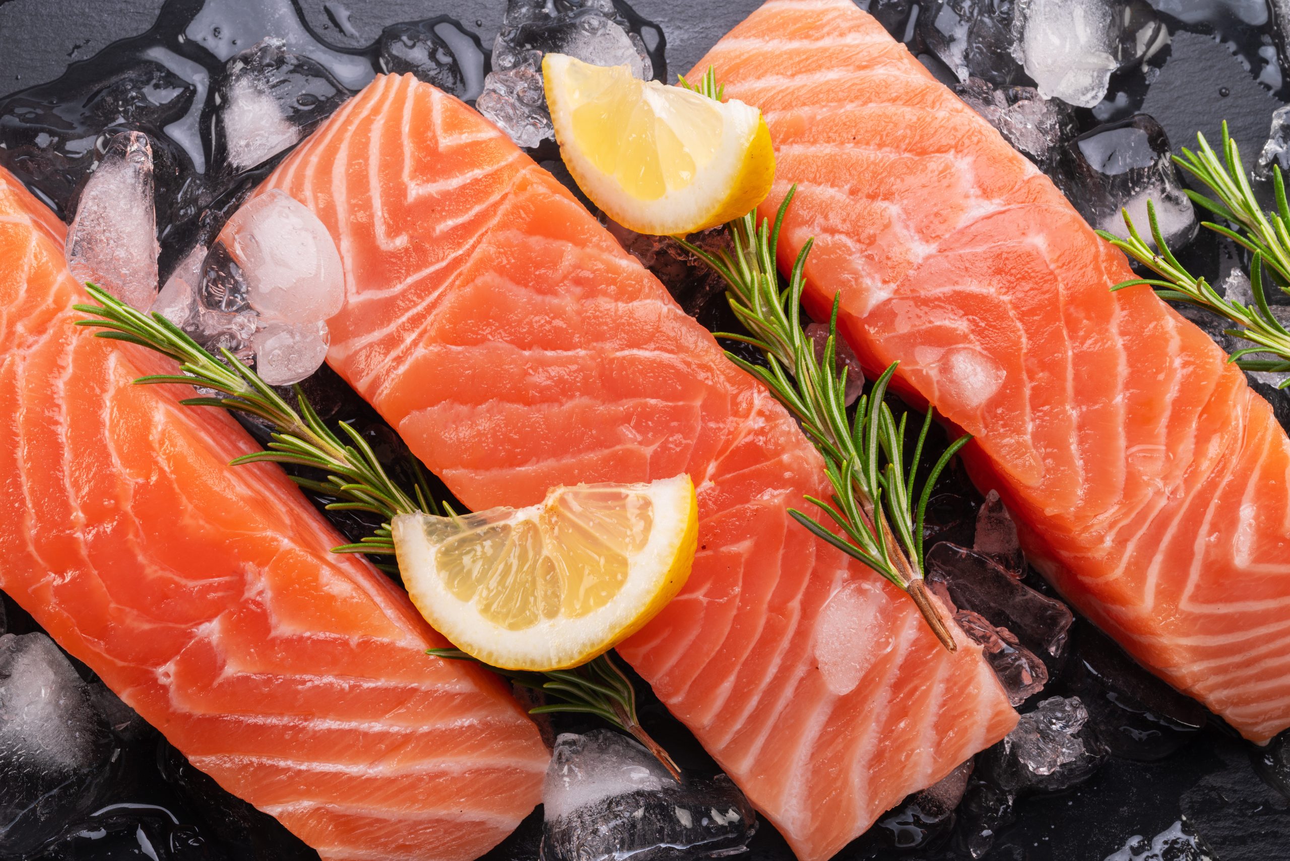 Salmon, chilled fresh salmon fillet slices in ice cubes on graphite slate cutting board.