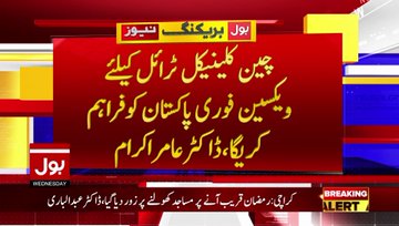 ڈاکٹر عامر اکرام کا کہنا ہے کہ ہیومین کلنیکل ٹرائل کے لئے ویکسین فوری طور پر چین پاکستان کو بھی فراہم کرے گا، تین سے چار ماہ میں مکمل ٹرائل کے بعد کورونا ویکسین باقاعدہ لانچ کر دی جائے گی۔