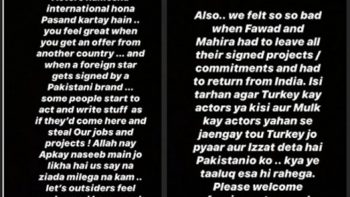 اداکار نے اس توجہ دلائی کہ انہوں نے لکھا کہ فواد اور ماہرہ جب اپنا کام ادھورا چھوڑ کر بھارت سے وطن واپس آئے تو ہمیں بہت بُرا لگا تھا، اسی طرح اگر ترکی کے اداکار یا کسی اور ملک کے اداکار یہاں سے جائیں گے تو یقیناً وہاں کے لوگوں کو بُرا لگے گا۔