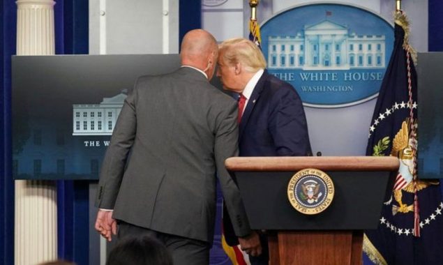 تفصیلات کے مطابق امریکی صدر کو وائٹ ہاؤس میں پریس بریفنگ کے دوران خفیہ سروس کے اہلکار باہر لے گئے۔