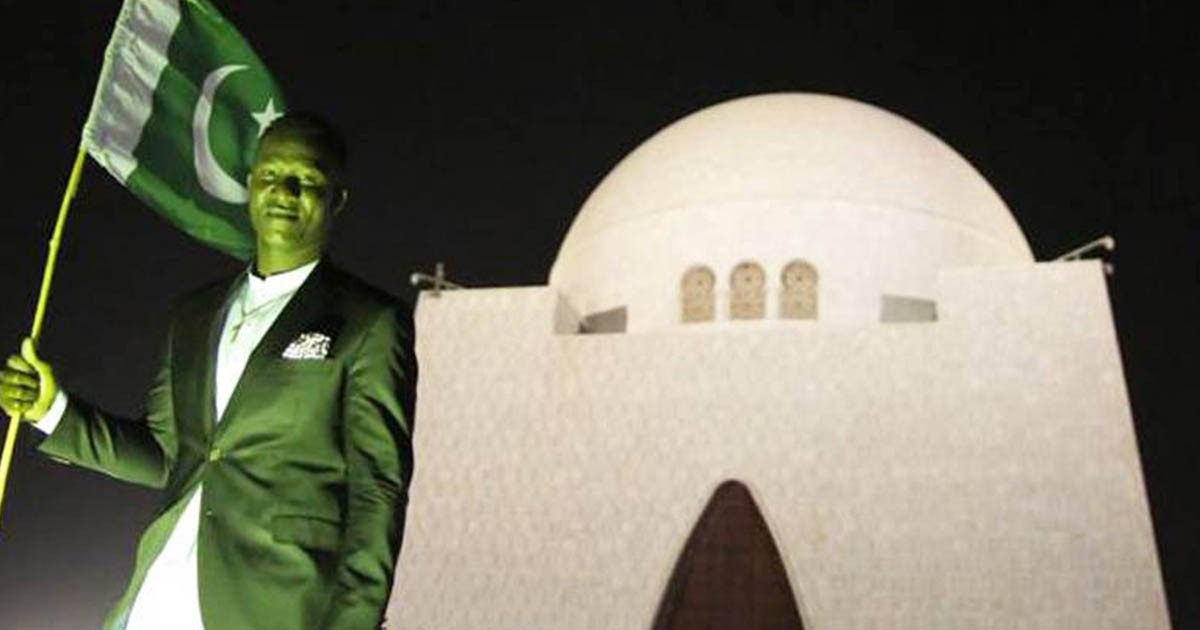 تفصیلات کے مطابق ویسٹ انڈیز کو دو مرتبہ ٹی ٹوئنٹی کا عالمی چیمپئن بنوانے والے کپتان ڈیرن سیمی نے سماجی را بطے کی ویب سائٹ ٹوئٹر پر ایک پیغام جا ری کیا ہے جس میں وہ مزار قائد پر مو جودہیں اور سبز ہلالی پر چم بھی تھا ما ہوا ہے۔