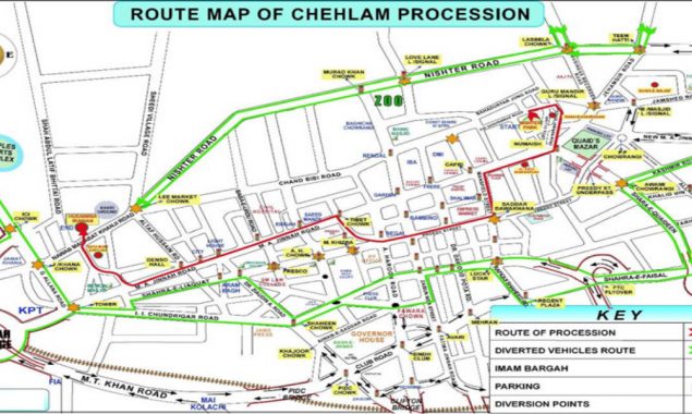ترجمان ٹریفک پولیس کے مطابق 20 صفر ،8 اکتوبر کو مرکزی جلوس نشتر پارک سے دوپہر ایک بجے برآمدہوگا، مرکزی جلوس سے قبل صبح 9 بجے مارٹن روڈ شاہ نجف امام بارگاہ سے علم کا جلوس برآمد ہوگا۔