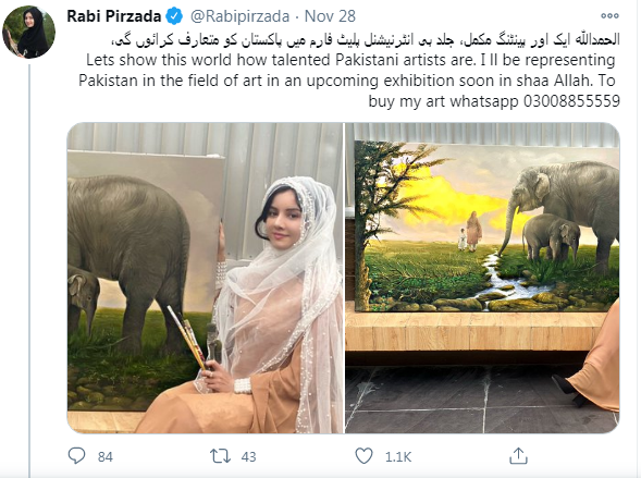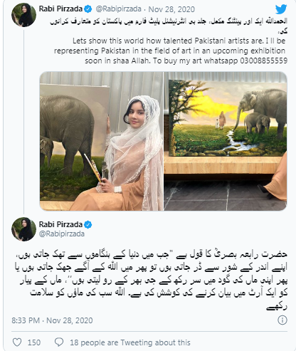 واضح رہے کہ رابی پیرزادہ نے شوبز چھوڑنے کے بعد مصوری کو اپنا ذریعۂ معاش بنالیا ہے۔