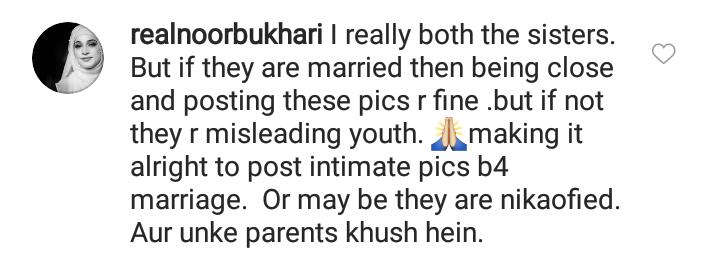 واضح رہے کہ اداکارہ نور بخاری نے نوجوان اداکارہ منال خان کو مشورہ دیتے ہوئے کہا تھا کہ انہیں واقعی منال خان اور ایمن خان بہت زیادہ پسند ہیں لیکن ایسی تصاویر بنا کسی رشتہ میں منسلک ہو کر پوسٹ کرنا مناسب نہیں ہیں۔