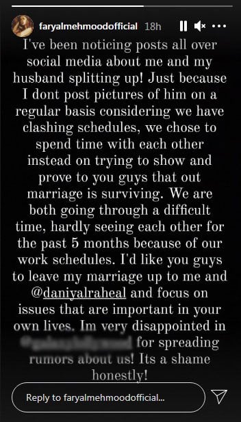 فریال محمود کی جانب سے پوسٹ کی جانے والی اسٹوری میں اداکارہ نے لکھا کہ اس وقت وہ اور اُن کے شوہر دانیال راحیل ایک مشکل وقت سے گُزر رہے ہیں۔