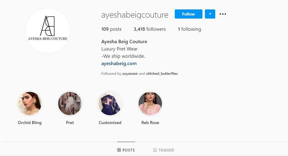 دوسری جانب عائشہ بیگ پیشہ کے لحاظ سے ڈیزائنر ہیں، اُن کا ’عائشہ بیگ کوؤچر‘ کے نام سے انسٹاگرام پر ایک پیچ بھی ہے۔