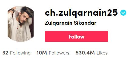 پاکستان کے شہر لاہور سے تعلق رکھنے والے نامور ٹک ٹاک ہیرو ذوالقرنین سکندر ویڈیو شیئرنگ ایپ ٹک ٹاک پر ایک کروڑ فالوورز مکمل ہونے کا اعزاز حاصل کر لیا ہے۔