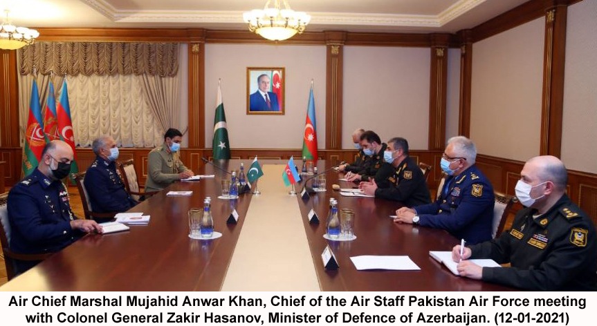 سربراہ پاک فضائیہ ایئر چیف مارشل مجاہد انور خان نے آج وزیر دفاع آذربائیجان کرنل جنرل ذاکر حسنوف اور کمانڈر آذربایئجان ایئر فورس لیفٹیننٹ جنرل رمیز طاہروف سے ملاقات کی ہے جس میں پیشہ ورانہ امور اور باہمی تعاون پر تبادلہ ء خیال کیا گیا ہے۔