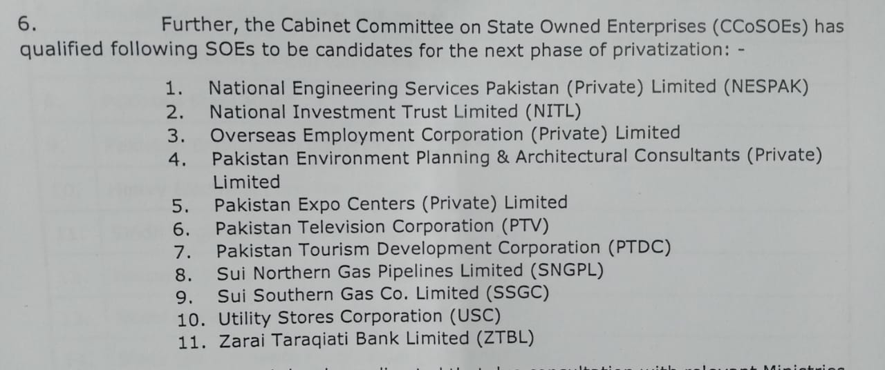 دستاویزات کے مطابق پاکستان ٹیلی ویژن کارپوریشن کو نجکاری کی فہرست نکال دیا جبکہ اگلے مرحلے میں جن اداروں کی نجکاری کی جائیگی ان میں یوٹیلیٹی اسٹورز کارپوریشن شامل ہیں۔
