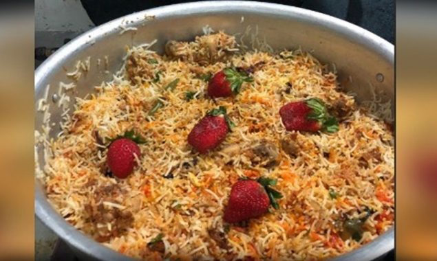 تصویر کو دیکھ کر باخوبی یہ اندازہ لگایا جا سکتا ہے کہ اسٹرابیریز کو بریانی پکتے ہوئے شامل نہیں کیا گیا بلکہ بعد میں اوپر سے رکھا گیا ہے۔